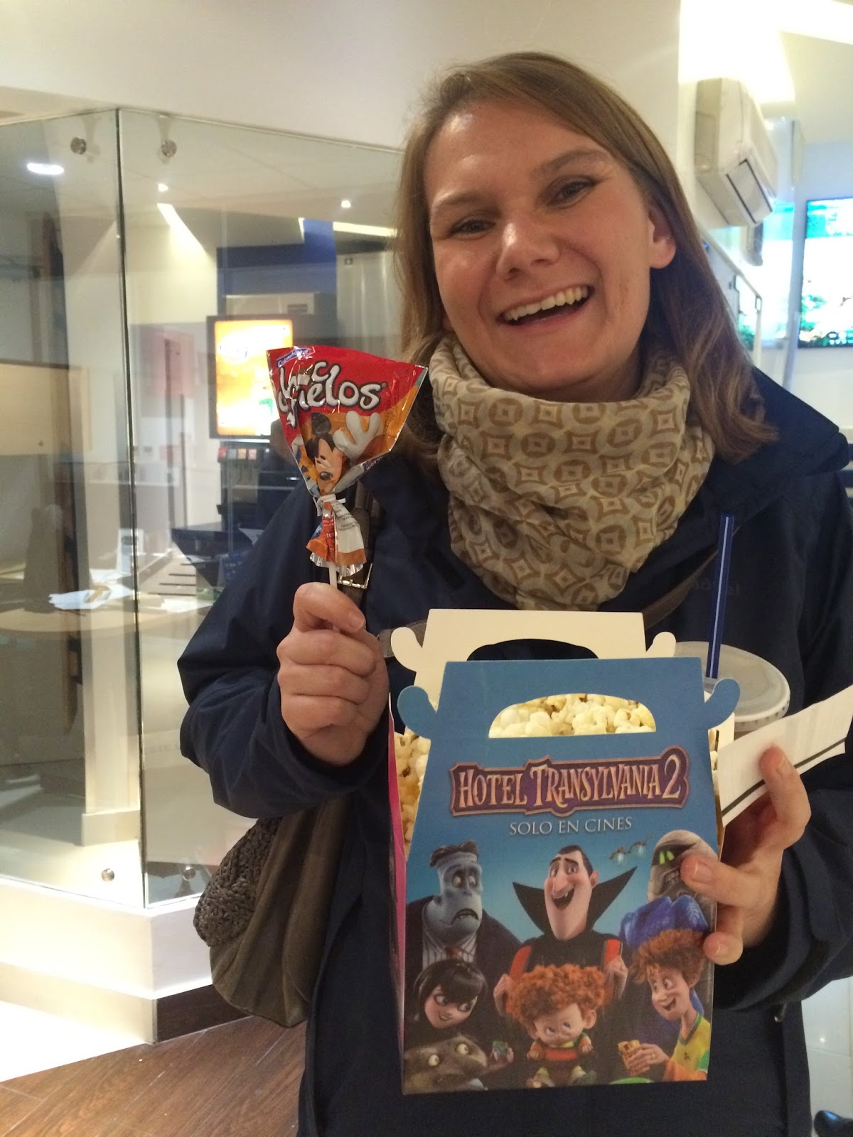 Popcorn sizes are ridiculously disproportionate here in Bogota. I requested for a "Small" size popcorn and received a rice-cooker sized bucket filled with popcorn. Sabrina saw this and requested a kid size and got this: